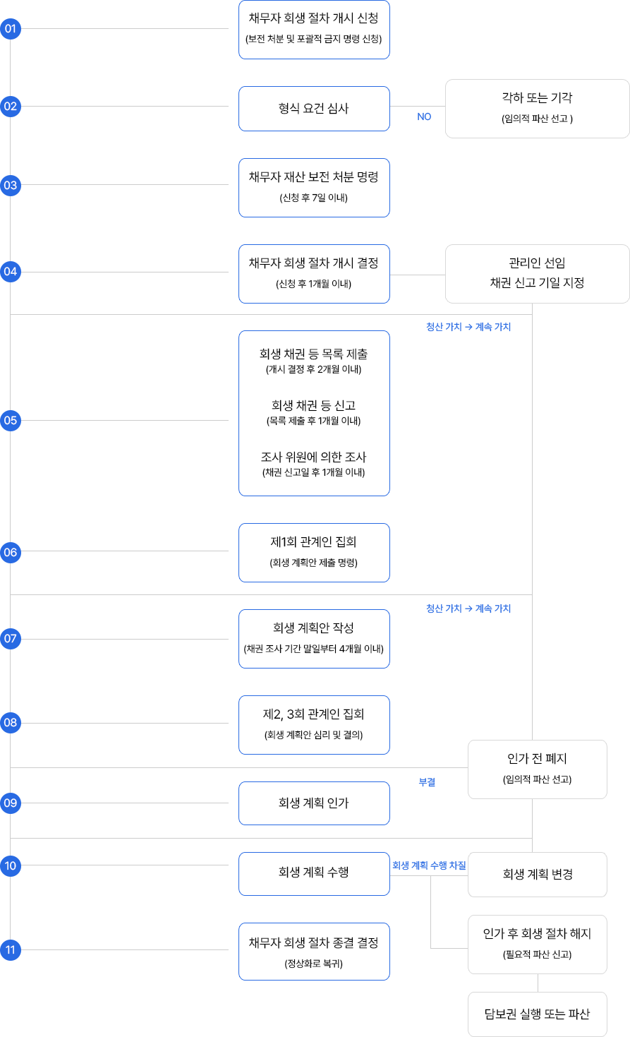 재정적 어려움에 처한 기업이 당장 회사 자산을 처분하는 것보다 사업을 계속해나가는 것이 채권자 등 이해관계인에게 더 이익이 된다고 판단할 때, 법률관계 및 채무를 조정하여 정상 기업으로 복귀시키는 절차