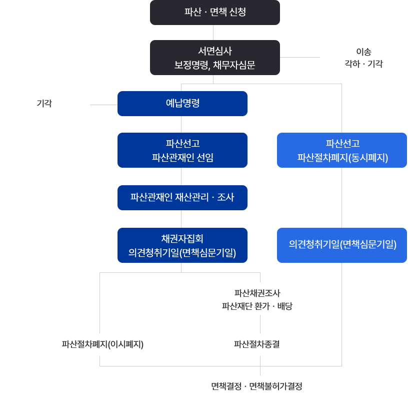 재정적 파탄에 처한 채무자가 법원을 통해 재산을 환가(현금화)하고 채권자에 대한 배당절차를 이행함으로써 잔여채무를 면책받고 신분이 복권되어 경제적 재기와 갱생의 기회를 부여받는 절차